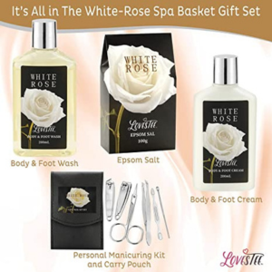 - The white rose essential oils in this bath spa gift basket for women release a delicate floral aroma that soothes mind and body, while also helping naturally restore the suppleness and dewy glow of skin for anti-aging effects.