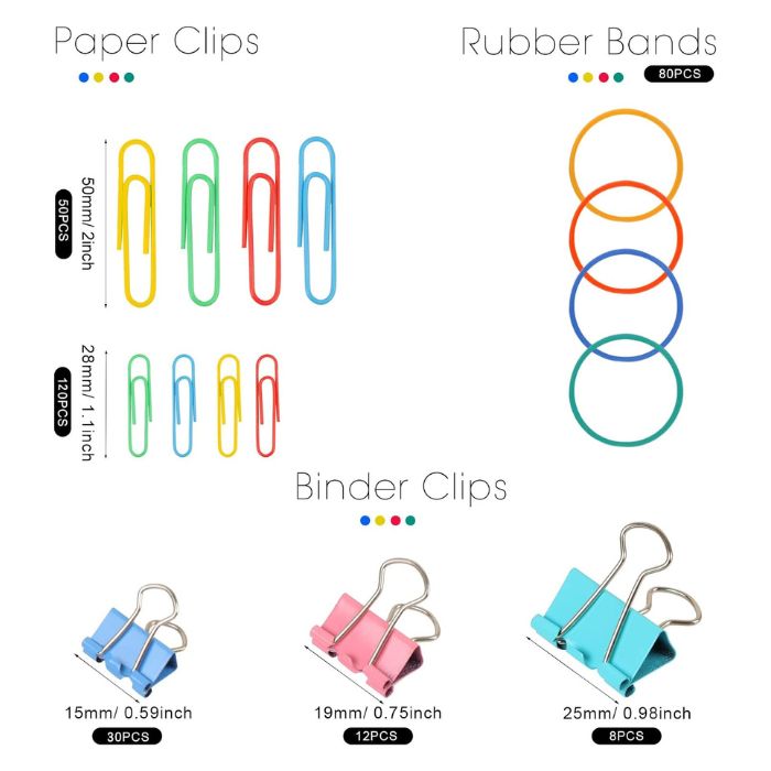 • High cost performance: 50pcs (50mm) and 120pcs (28mm) colour paper clips. 80pcs colour rubber bands. 8pcs (25mm), 12pcs (19mm) and 30pcs (15mm) colour binder clips. They are stored in different grids in reusable plastic containers for easy to find or storage.